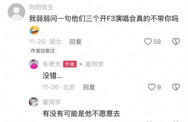 记者蔡琛仪/综合报导       F4今年两度在五月天演唱会上合体后,引发不少回响,不过近日言承旭、周渝民、吴建豪与五月天阿信、周杰伦世纪合体推出新歌〈恒星不忘ForeverForever〉,以及宣布F3与阿信将举办演唱会,皆没有朱孝天身影,形同将朱判出局,朱孝天昨上传影片,称自己和相信音乐无合约关系,3个月前正式拒绝相信音乐񊄫个要求后,就被单方面断联,更点名相信音乐营运长谢芝芬(艾姐)对自己抹黑、泼脏水。       ▼朱孝天(下图右)被除名F4,新歌及演唱会都没有他的身影,上为F3与五月天阿信。(图/相信音乐提供)       不过网友对此几乎全一面倒挺相信音乐,认为朱孝天自己先拒绝唱片公司的要求,又怪对方没找他,有网友挖出他向粉丝坦言自己不愿参加演唱会的留言,以及过去在直播泄密、透露讨厌听F4歌曲等发言;还有人找到今𻂏月,朱孝天在南京举办个人演唱会时,五月天和艾姐分别挂上唱片公司名称送上花篮祝福的照片,质疑朱孝天认为自己「被抹黑、泼脏水」的说法根据为何,更有网友幽默以五月天〈终结孤单〉歌词讽朱孝天:「约你你说不来,来了你又不嗨。」       相信音乐虽表示:「不予回应。」但相信音乐的工作人员也纷纷发声,五月天经纪人在Threads上意有所指的发文:「请回头看看自己先唷~」另一名相信音乐高层也留言:「那个自己他只想自己的流量。」       网友挖出朱孝天上个月底承认自己不愿去演唱会的留言。(图/翻摄微博)       事实上先前朱孝天就曾在直播中表示,谢芝芬和五月天阿信两年前就曾想要找F4合体,还亲自出马说服朱孝天多次;阿信前天开直播,也透露谢芝芬这些日子为了促𽒤人合体,搭飞机的里程数多到足以绕地球两圈,更直言:「接下来还是不会放弃任何机会,呈现给大家最想看的所谓的最完整的阵容。」当时朱孝天说的多热血,如今却反过来狠咬相信音乐,让许多粉丝无法接受。